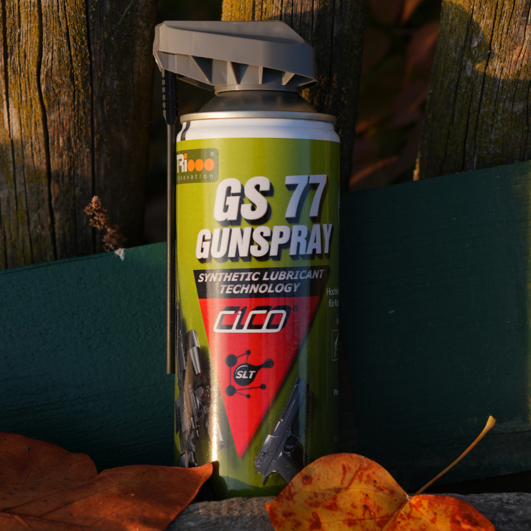Der erste Schritt. Löst aggressiven Schmauch, Pulverreste und verharzte Alt-Öle zuverlässig an. Die Formel ist geruchsneutral und greift weder Polymere, Holzschäfte noch Beschichtungen an. Trocknet absolut rückstandsfrei ab. - 1x CICO® GS77 Gunspray (Schutz & Funktion):